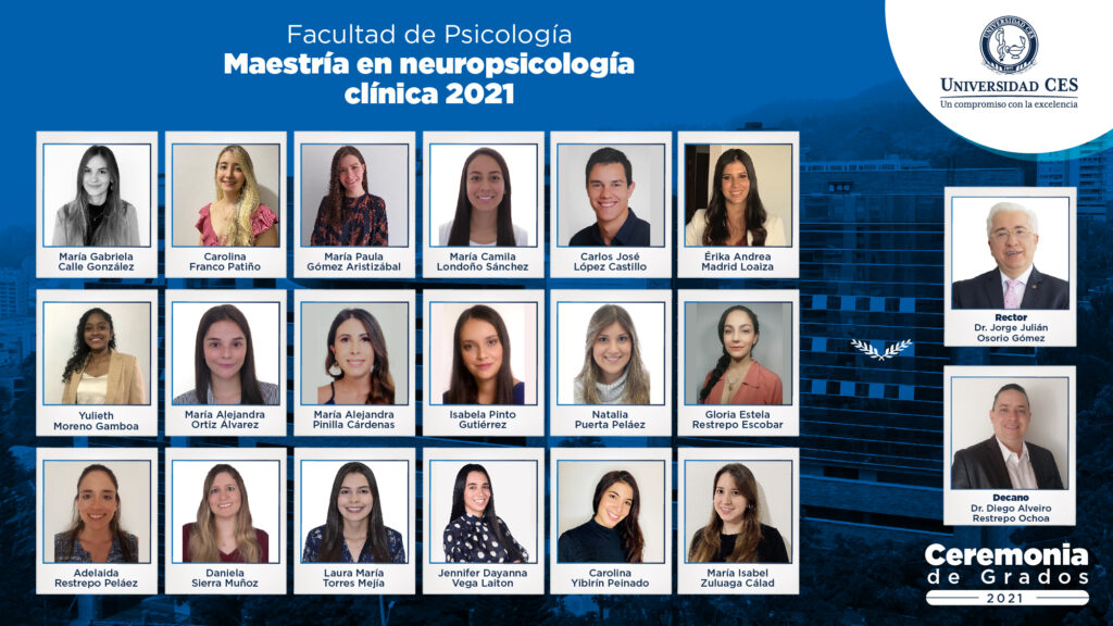 La Facultad de Psicología de la Universidad CES llevó a cabo el grado de los primeros 30 estudiantes de las cohortes en las maestrías de Neurosicología Clínica y Psicología Jurídica y Forense, el pasado 23 de septiembre de 2021.